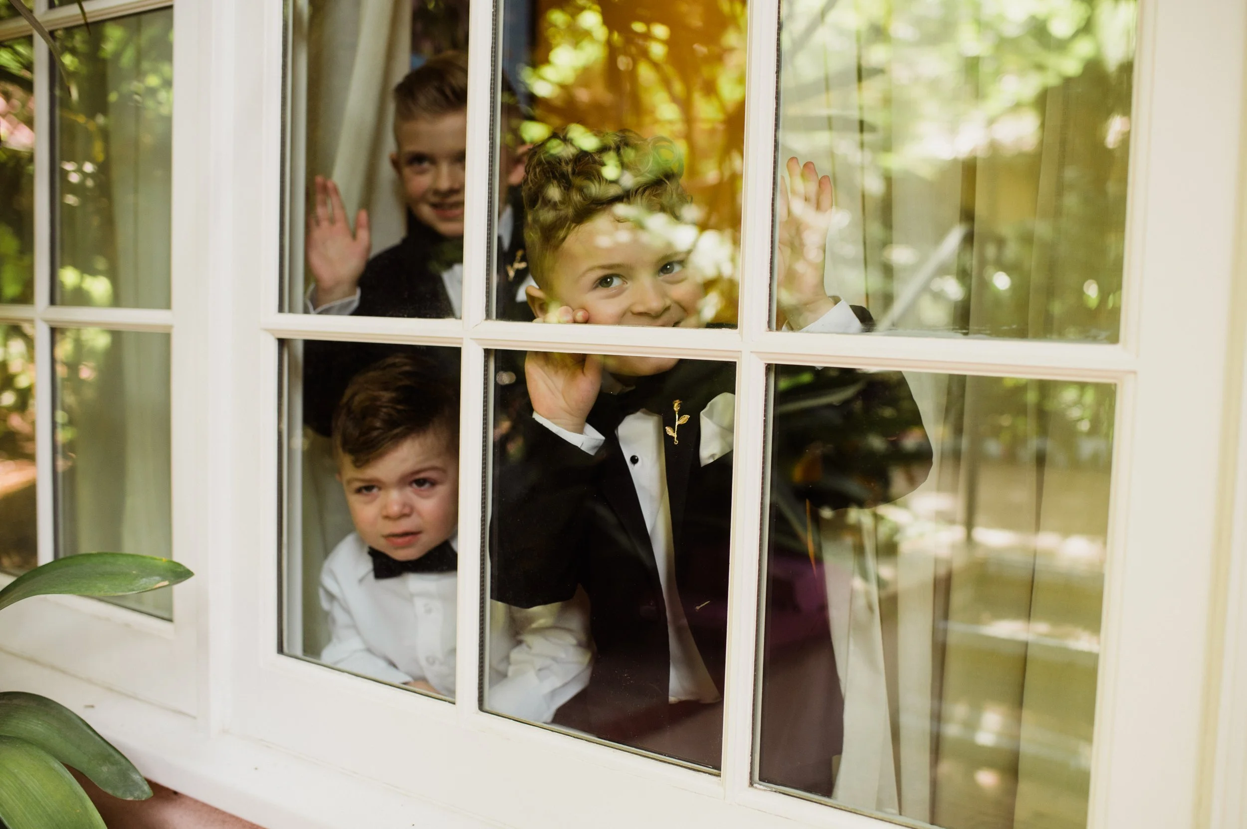 Elegant wedding invitation suite with floral accents, including white roses and greenery, on a white surface.