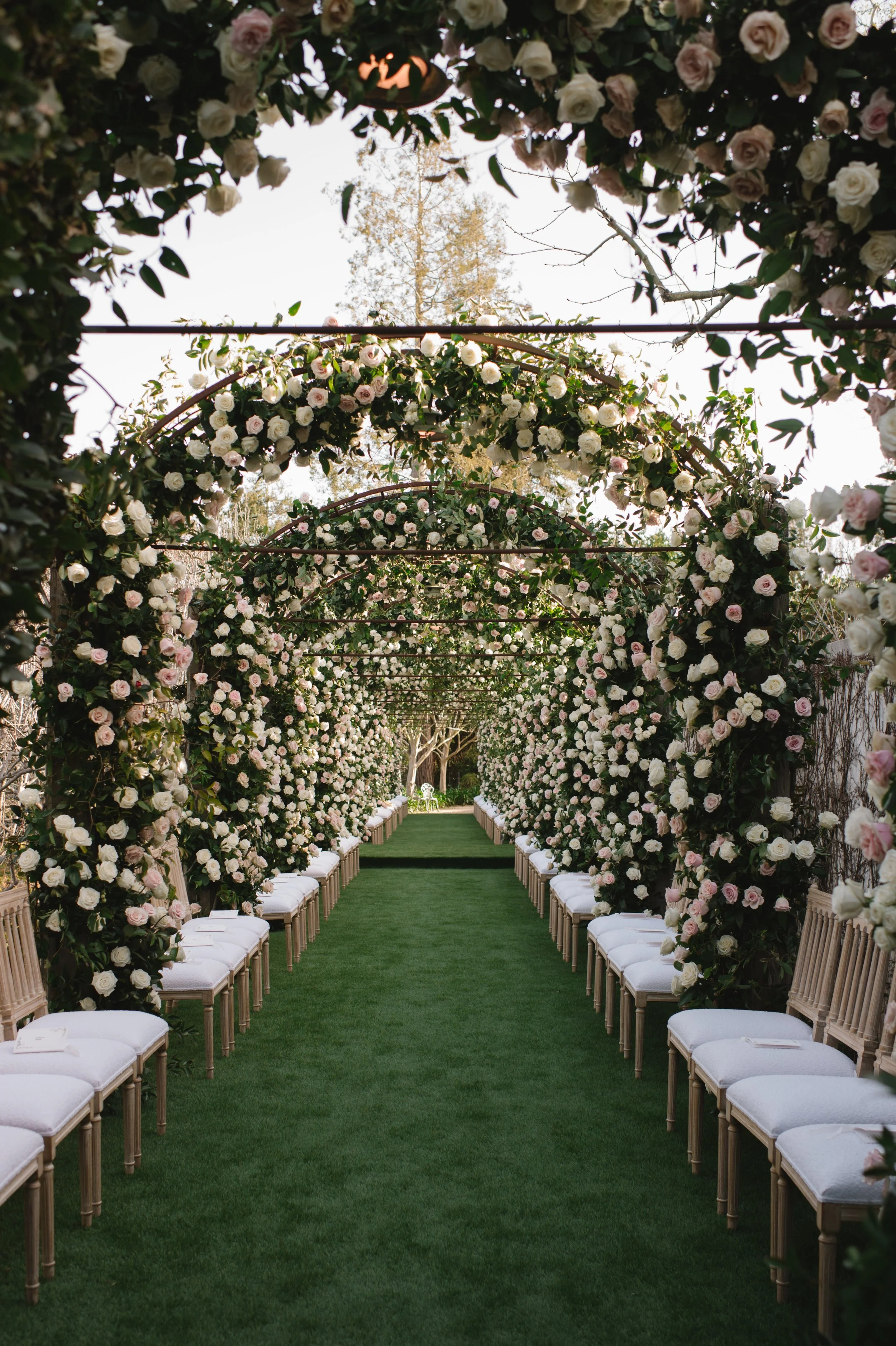 A decorated floral aisle with white chairs and arches adorned with pink and white roses for a wedding ceremony.